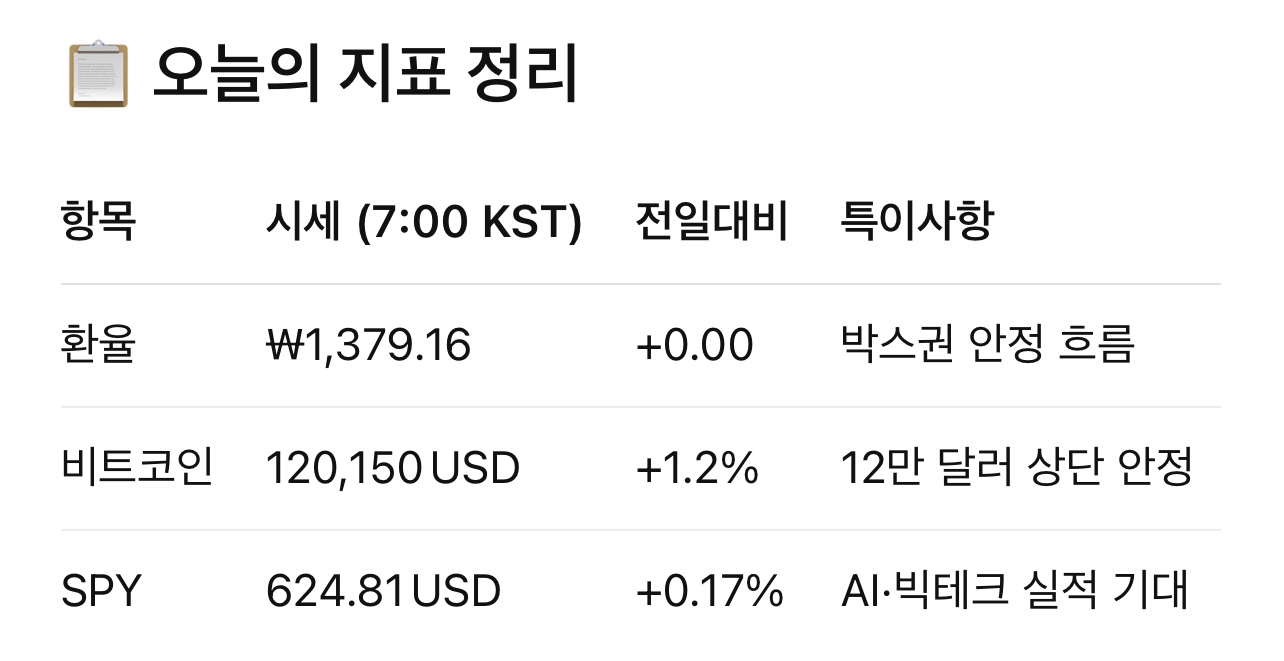 오늘도 활기차게 시작할 수 있는 금융 소식을 블로그 스타일로 맛깔나게 전해드릴게요!💱 원·달러 환율1 USD = ₩1,379.16 (최근 실시간 시세 기준) 전일 대비 변동은 거의 없으며, 한 달 기준 ₩1,364 ~ ₩1,379 사이 박스권 움직임 속 안정세입니다.글로벌 달러 약세 흐름에도 원화는 견조한 모습. 수출 기업엔 부담 없는 환율입니다.₿ 비트코인 동향현재 시세: 약 120,150 USD → 전일 대비 +1,425 USD 상승 (+1.2%) 일중저가/고가: 118,427 USD ~ 122,852 USD12만 달러 선 위에서 안정적인 박스권 흐름! 투자 심리는 여전히 강세입니다.🇺🇸 미 증시 – SPY (S&P 500 ETF)현재 시세: 약 624.81 USD → 전일 대비 +1.0..