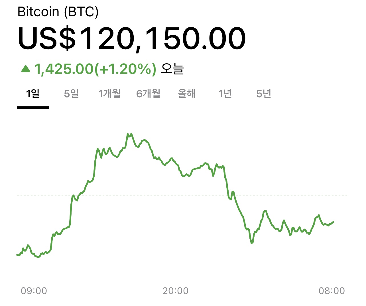 - 현재 시세: 약 120,150 USD → 전일 대비 +1,425 USD 상승 (+1.2%)